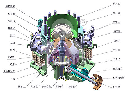 工作時,由電動機通過三角帶、大帶輪、傳動軸、小錐齒輪、大錐齒輪帶動偏心套旋轉(zhuǎn),破碎圓錐軸心線在偏心軸套的迫動下做旋轉(zhuǎn)擺動,使得破碎壁表面時而靠近又時而離開軋臼壁的表面,從而使物料在定錐與動錐組成的環(huán)形破碎腔內(nèi)不斷地受到?jīng)_擊、擠壓和彎曲而破碎。經(jīng)過多次擠壓、沖擊和彎曲后,物料破碎至要求粒度經(jīng)下部排出。