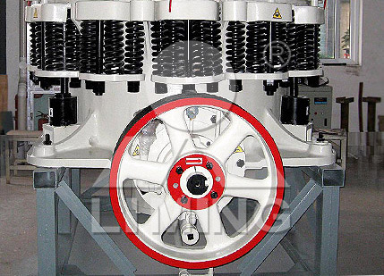 彈簧圓錐破碎機(jī)工作時(shí),電機(jī)通過(guò)液力偶合器、小圓錐齒輪驅(qū)動(dòng)偏心套底部的大圓錐齒輪,使偏心套旋轉(zhuǎn),致使錐體作旋擺動(dòng)而破碎物料。