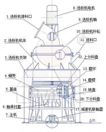 主機(jī)電動機(jī)通過減速機(jī)帶動主軸及各層轉(zhuǎn)盤旋轉(zhuǎn),轉(zhuǎn)盤通過柱銷帶動幾十個環(huán)輥在磨環(huán)滾道內(nèi)滾動并旋轉(zhuǎn)。大塊物料經(jīng)破碎機(jī)破碎成小顆粒后由提升機(jī)送入儲料倉,電磁振動給料機(jī)將物料均勻的送到上轉(zhuǎn)盤的中部,物料在離心力的作用下散向圓周邊,并落入磨環(huán)的滾道內(nèi)被環(huán)輥沖壓、滾碾、研磨而粉碎,物料經(jīng)第一層粉碎后又落入第二層及第三層,高壓離心風(fēng)機(jī)的抽吸作用將外部空氣吸入機(jī)內(nèi),并將經(jīng)過第三層粉碎后的粗粉帶入選粉機(jī)內(nèi)。選粉機(jī)內(nèi)旋轉(zhuǎn)的蝸輪所產(chǎn)生的蝸流使粗顆粒物料回落重磨,細(xì)粉則隨氣流進(jìn)入旋風(fēng)集粉器并由其下部的卸料閥排出即為成品,而帶有少量細(xì)粉塵的氣流則經(jīng)過脈沖除塵器凈化后通過風(fēng)機(jī)及消聲器排出。